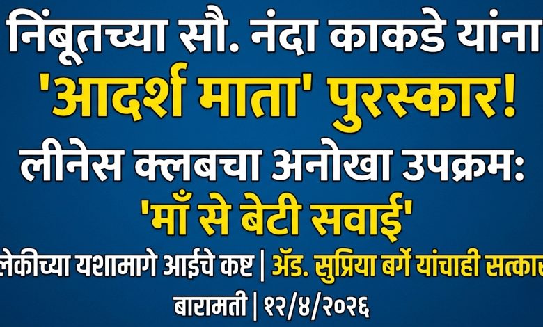 लीनेस क्लबतर्फे निंबूतच्या सौ. नंदा काकडे यांना ‘आदर्श माता’ पुरस्कार प्रदान; ‘माँ से बेटी सवाई’ उपक्रमाला उत्स्फूर्त प्रतिसाद