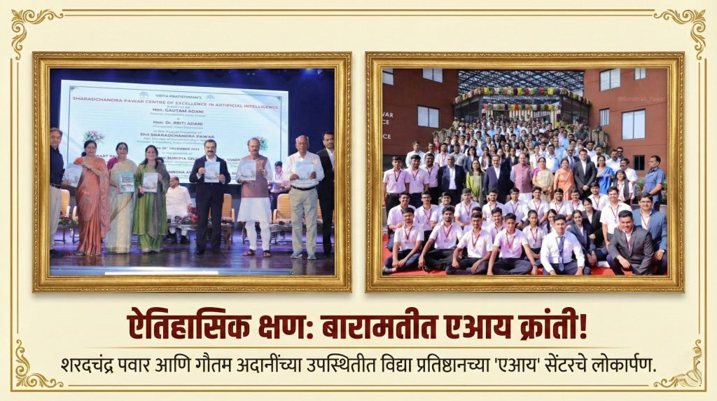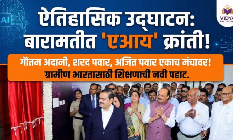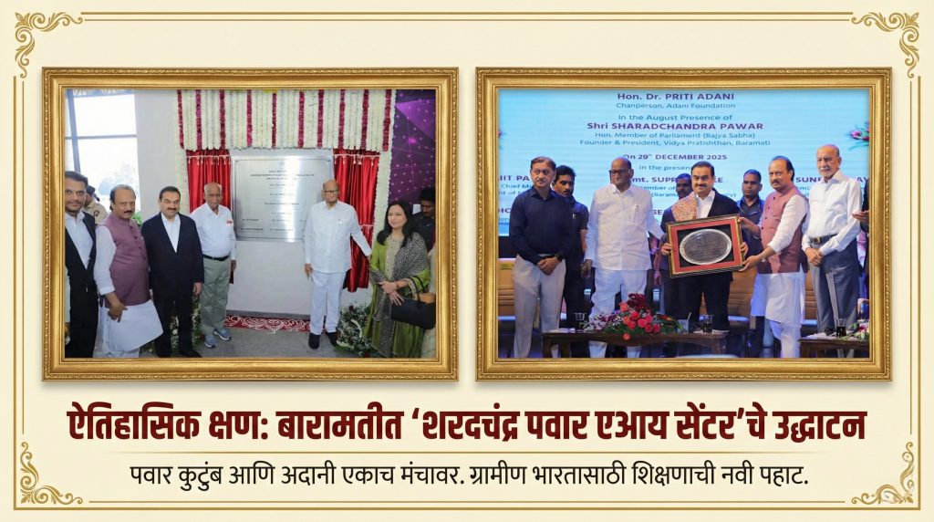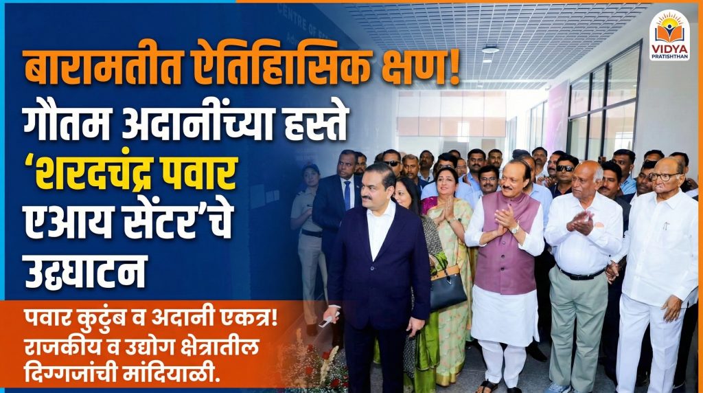 * विद्या प्रतिष्ठानमध्ये देशातील पहिल्या ग्रामीण 'एआय' सेंटरचा शुभारंभ. * अदानी समूह आणि विद्या प्रतिष्ठान यांच्यात महत्त्वपूर्ण सामंजस्य करार (MoU). * शरद पवार, अजित पवार, सुप्रिया सुळे आणि सुनेत्रा पवार एकाच मंचावर. * "बारामती हे केवळ गाव नाही, तर जीवनाचे प्रतीक," गौतम अदानींचे गौरवोद्गार.