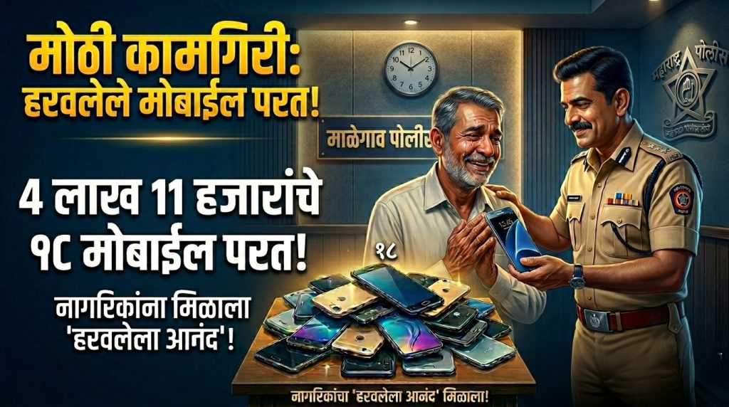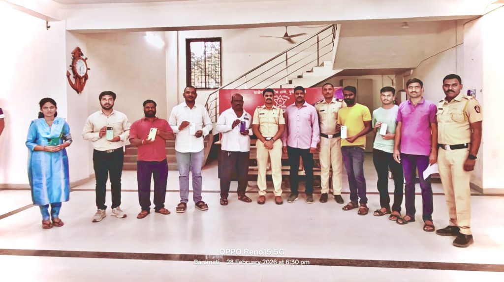 माळेगाव बुद्रुक (बारामती): पुणे ग्रामीण पोलीस दलातील माळेगाव पोलीस ठाण्याने एक कौतुकास्पद कामगिरी केली असून, नागरिकांचे हरवलेले एकूण १८ मोबाईल शोधून ते त्यांच्या मूळ मालकांना सुपूर्द केले आहेत. या मोबाईलची एकूण किंमत ४ लाख ११ हजार रुपये इतकी आहे.