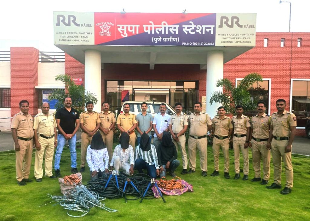 बारामती : दि.०८/१०/२०२५ रोजी पो. हवालदार राहुल भाग्यवंत हे सुपा पोलीस स्टेशन हद्दीत रात्रगस्त करीत असताना त्यांना गोपनीय बातमीदारा मार्फत बातमी मिळाली की,तरडोली, ता. बारामती, जि.पुणे गावचे हद्दीत शंकर खरात यांच्या मालकीच्या पत्र्याच्या शेड मध्ये काहीजण चोरलेल्या मोबाईल टॉवरचे केबल तसेच मोटारीच्या केबल यामधील तांब्याच्या तारा काढत आहेत. मिळालेल्या बातमीची खात्री करण्याकरीता प्रभारी अधिकारी स.पो.नि.मनोजकुमार नवसरे,पो.हवा. भाग्यवंत, पो.शि. ताडगे, विरमे, मवाळ असे पहाटे ०३:०० वाजताचे सुमारास त्या ठिकाणी गेले असता त्या ठिकाणी १) ओम राजेंद्र कासवदे, वय १९ वर्षे, २) संतोष सतिश गायकवाड, वय १९ वर्षे, ३) करण भाऊसाहेब आरवडे, वय १९ वर्षे, सर्व रा.मोरगाव, ता. बारामती, जि.पुणे, ४) आण्णा आंबादास कोकाटे, वय २९ वर्षे, रा.कुंभेजा, ता. परांडा, जि.धाराशीव हे केबल मधुन तांब्याच्या तारा काढत असताना मिळुन आले.