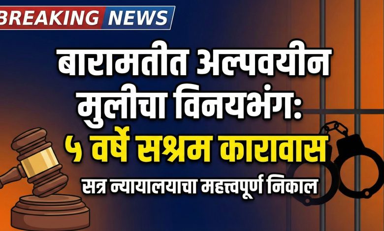 बारामती: अल्पवयीन मुलीचा विनयभंग केल्याप्रकरणी बारामती येथील अतिरिक्त जिल्हा व सत्र न्यायालयाने एका आरोपीस ५ वर्षे सश्रम कारावास आणि २५ हजार रुपये दंडाची शिक्षा सुनावली आहे. तसेच, जीवे मारण्याची धमकी दिल्याप्रकरणी २ वर्षे सश्रम कारावास आणि २५ हजार रुपये दंडाची शिक्षा ठोठावण्यात आली आहे. हा निकाल मे. अति. सत्र न्यायाधीश मा. एच. ए. वाणी यांनी दिला.