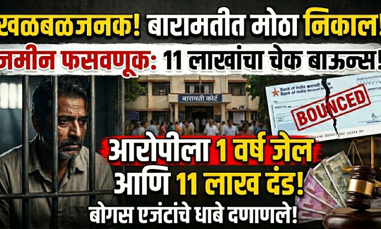 बारामती : जमीन घेऊन देण्याच्या बहाण्याने लाखोंची फसवणूक करून दिलेला धनादेश (चेक) बाऊन्स झाल्याप्रकरणी बारामती न्यायालयाने एक महत्त्वपूर्ण आणि खळबळजनक निकाल दिला आहे. या प्रकरणात न्यायालयाने आरोपीला दोषी ठरवत १ वर्षाचा सश्रम कारावास आणि ११ लाख रुपयांचा दंड ठोठावला आहे. न्यायालयाच्या या धडक कारवाईमुळे बोगस जमीन खरेदी-विक्री करणारे आणि फसवणूक करणाऱ्या एजंटांचे धाबे दणाणले आहेत.