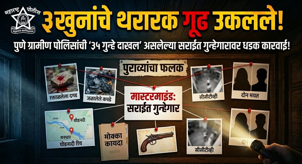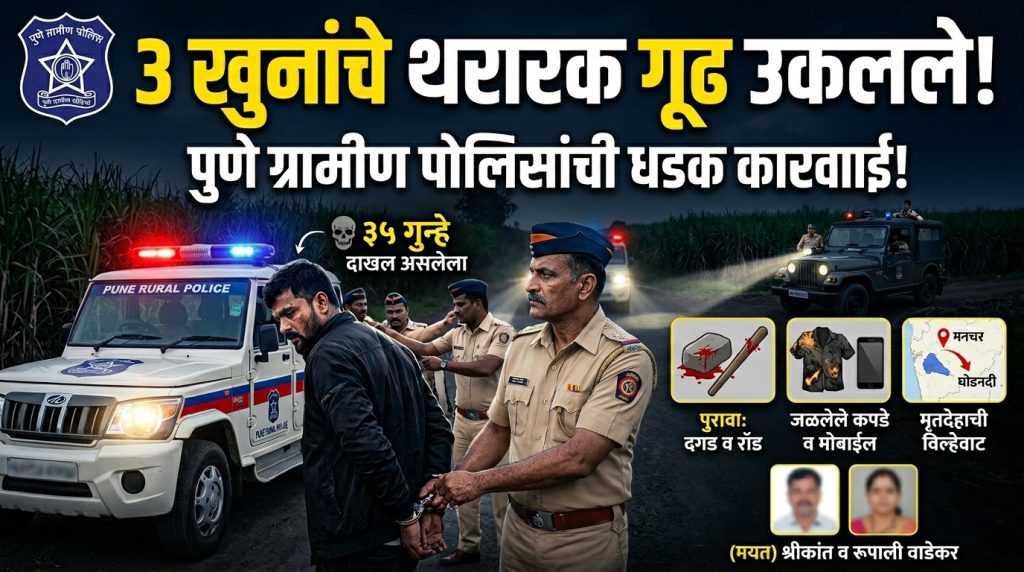 बारामती : पुणे जिल्ह्यातील खेड आणि ठाणे शहर हद्दीत घडलेल्या तब्बल तीन वेगवेगळ्या खुनांच्या घटनांचा छडा लावण्यात पुणे ग्रामीण पोलिसांच्या स्थानिक गुन्हे शाखेला (LCB) आणि खेड पोलिसांना मोठे यश आले आहे. तब्बल ११४ सीसीटीव्ही कॅमेऱ्यांचा मागोवा घेत आणि उसाच्या शेतातून थरारक पाठलाग करत पोलिसांनी ३५ गंभीर गुन्हे दाखल असलेल्या सराईत गुन्हेगाराला आणि त्याच्या साथीदाराला जेरबंद केले आहे. या कारवाईत दोन गावठी पिस्तूल आणि काडतुसेही जप्त करण्यात आली आहेत.