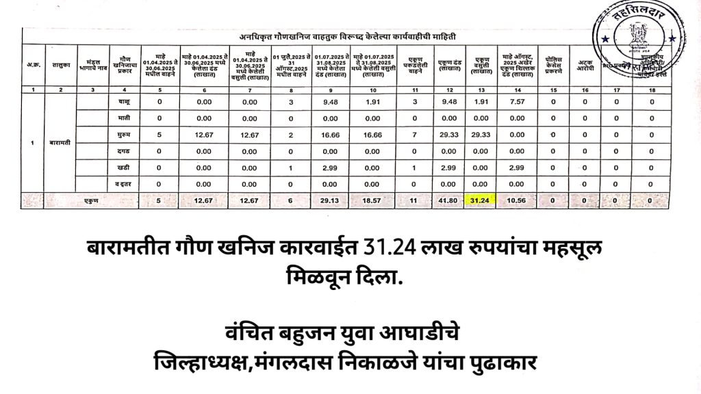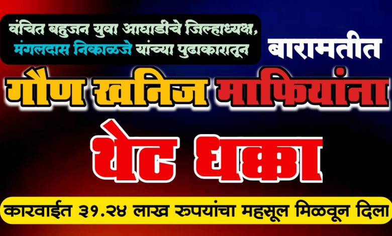 बारामतीत गौण खनिज माफियांना थेट धक्का, कारवाईत 31.24 लाख रुपयांचा महसूल मिळवून दिला,वंचित बहुजन युवा आघाडीचे जिल्हाध्यक्ष,मंगलदास निकाळजे यांचा पुढाकार